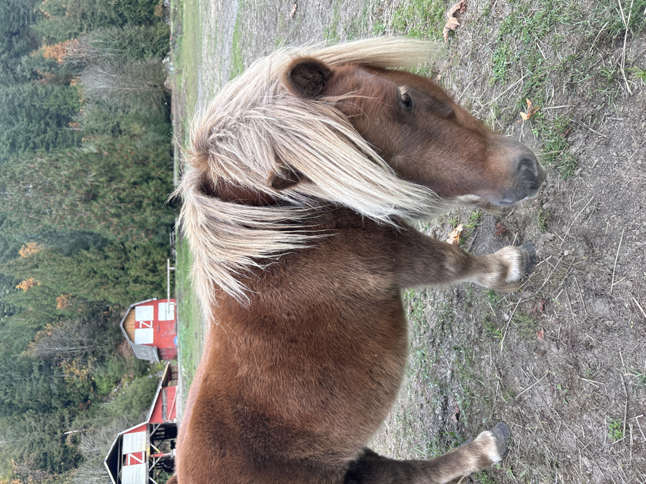 The image portrays a rural landscape in Area D (Elaho/Garibaldi), Canada. A brown pony with a thick, shaggy coat and a long, creamy-blonde mane and forelock occupies the foreground. The pony's head is lowered and angled slightly right, with its forelock partially obscuring its left eye. It stands on uneven ground, which is a mix of bare earth, sparse green grass, and scattered dry brown leaves. In the mid-ground, two red barns or outbuildings are visible. The larger barn on the left has white "Z" markings and a white sliding door, with an exposed wooden support structure below. The smaller barn on the right also features white "Z" markings and white door panels. A segment of a wooden fence or rail is present near the right barn. The background consists of a dense forest covering a mountain slope, predominantly evergreen conifers, with interspersed deciduous trees displaying autumn coloration. No human subjects or direct interactions are depicted.