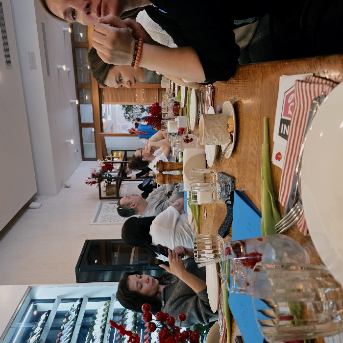 The image depicts an indoor scene within a restaurant or cafe in the city of Pushkin, Russia, where a group of individuals is seated at a long, light-brown wooden table. In the immediate foreground, a white plate, silverware on a red and white striped napkin, and glasses are visible. To the left, a woman with dark hair, wearing a grey sweater, is looking at and holding a black smartphone. Across the table from her, a blue folder and green tulip stems are present. Further along the table, a ceramic mug on a saucer with a small cookie, wooden salt and pepper shakers, and multiple glasses, some containing liquid and red cranberries, are arranged. Seated to the right of the woman with the smartphone is a woman with dark hair in a white top, partially obscured. Beyond her, a man with short dark hair and a grey long-sleeved shirt is seated, arms crossed, looking to the right. To his right, another woman with dark hair is visible. In the mid-ground right, a woman with brown hair and a light-colored top is seated, looking towards the left with her hands clasped. Partially visible in the extreme foreground right is a woman with blonde hair, wearing a black top, with her right arm raised, adorned with an orange beaded bracelet. The background features a white wall with a large, illuminated glass wine cabinet displaying multiple bottles on the far left. A dark cabinet stands adjacent. Further back, through a wooden-framed opening, another brightly lit area is visible with additional people, including one person in a blue garment. Red decorative berry branches are placed on the table in the foreground and mid-ground. The room is well-lit, with recessed ceiling lights and a generally clean, modern aesthetic.