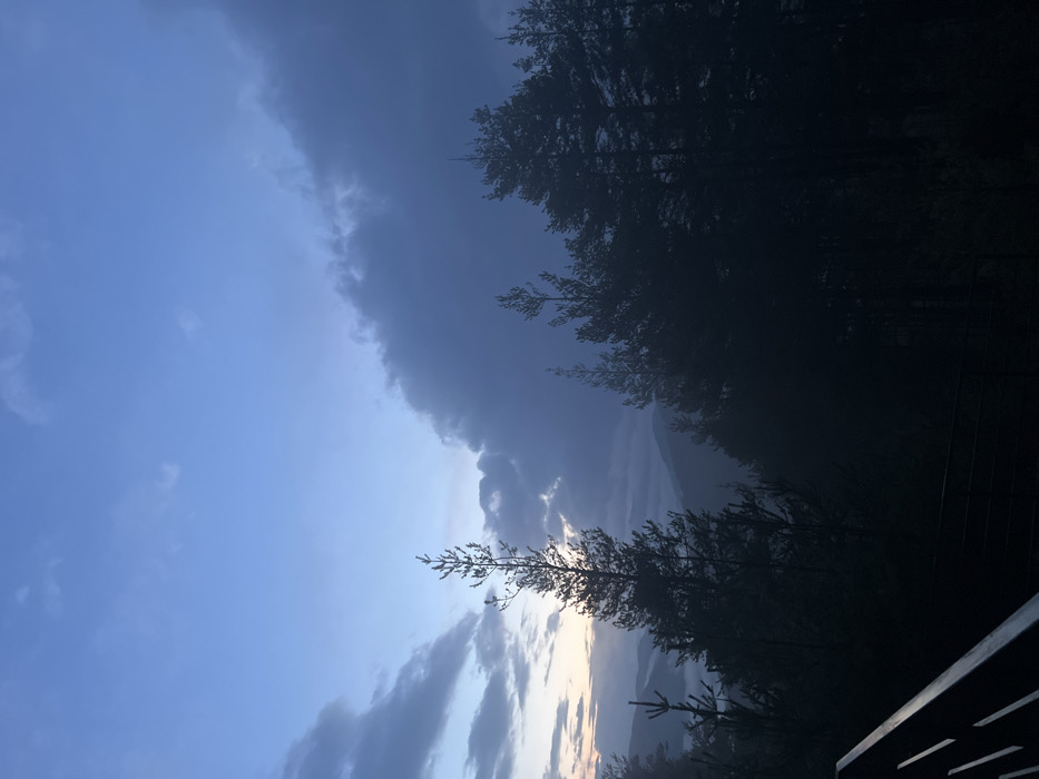 The image depicts a panoramic view of a mountainous landscape at dawn or dusk in Gradat, Bulgaria. The sky transitions from a faint orange and light blue glow on the western horizon, obscured by scattered, wispy clouds, to a deep indigo and dark grey overhead, dominated by a large, dense cloud bank in the upper right quadrant. The foreground and mid-ground are characterized by dense evergreen forest, with numerous tall conifers appearing as dark silhouettes against the sky and distant hills. A prominent conifer stands slightly left of center, partially backlit by the distant light source, revealing some branch detail. Farther peaks recede into a atmospheric haze or fog, forming undulating ridges. In the lower left, a dark railing, likely belonging to a balcony or elevated viewing platform, is partially visible, indicating the vantage point. No human figures or discernible activities are present.