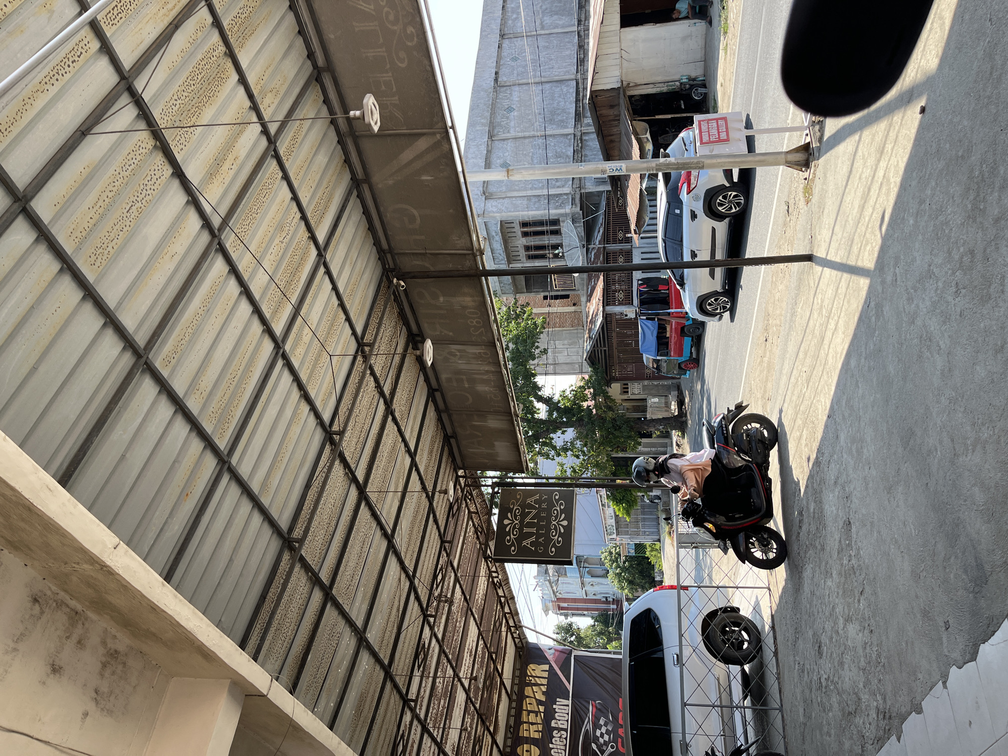 An outdoor urban scene in Lhokseumawe, Indonesia, is observed from under a weathered corrugated metal roof supported by dark metal beams. The roof exhibits significant rust and wear patterns, with several modern LED light fixtures suspended. To the immediate left, a portion of a black banner for "AUTO REPAIR" is visible, alongside a parked silver minivan behind a metal fence. Centrally positioned, a black sign with "AINA GALLERY" in white script hangs from the roof structure. In the midground, a person wearing a black helmet, light-colored long-sleeved top, and dark pants is seated stationary on a black Honda Scoopy scooter, positioned on a paved surface adjacent to the street. The scooter faces slightly right. Beyond the scooter, an asphalt road traverses the scene. On the road, a silver SUV is either stopped or moving towards the right. Further left on the road, a blue and red three-wheeled vehicle is parked. In the far right midground, a white sign with red text, partially visible, indicates "PARKIR KHUSUS PELANGGAN AINA GALLERY" (Special Parking for Aina Gallery Customers). A lone individual is seated on a low bench or stool in the far-right background. The background features a mix of multi-story buildings, including a prominent grey concrete structure with dark-framed windows and patterned facade details, interspersed with trees and utility poles. The environment is under bright daylight, evidenced by strong, well-defined shadows cast by the overhead structure and objects onto the paved ground.