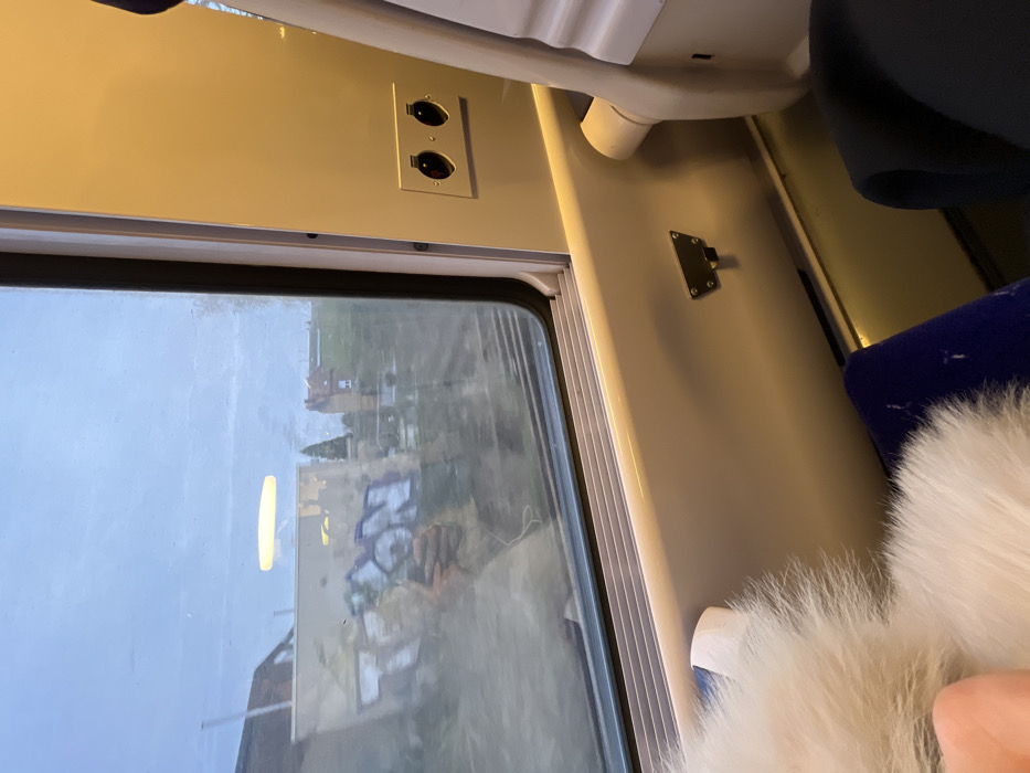 The image depicts the interior of a train carriage in Saint-André-lez-Lille, France, looking out a window at an exterior urban landscape under an overcast or twilight sky. In the foreground, a fair-skinned hand is partially visible, holding a large, white, fluffy object that rests on a dark blue fabric surface, likely a seat cushion. The train's interior features a light-colored wall panel with a large window to the left. Below the window, ribbed horizontal blinds are present. On the wall panel to the right of the window, a rectangular silver faceplate contains two black circular electrical outlets. Below these outlets, a small, dark-colored metal hook or latch is affixed to the wall. Part of a light-colored train seat structure is visible on the far right. A clear reflection of a person holding a dark-colored smartphone is visible in the window. Through the window, the exterior shows parallel train tracks, a structure or wall with prominent multi-colored graffiti, and several brick-colored buildings in the middle distance. A bright, horizontal yellow light source is visible high in the sky through the window, possibly a distant light fixture.