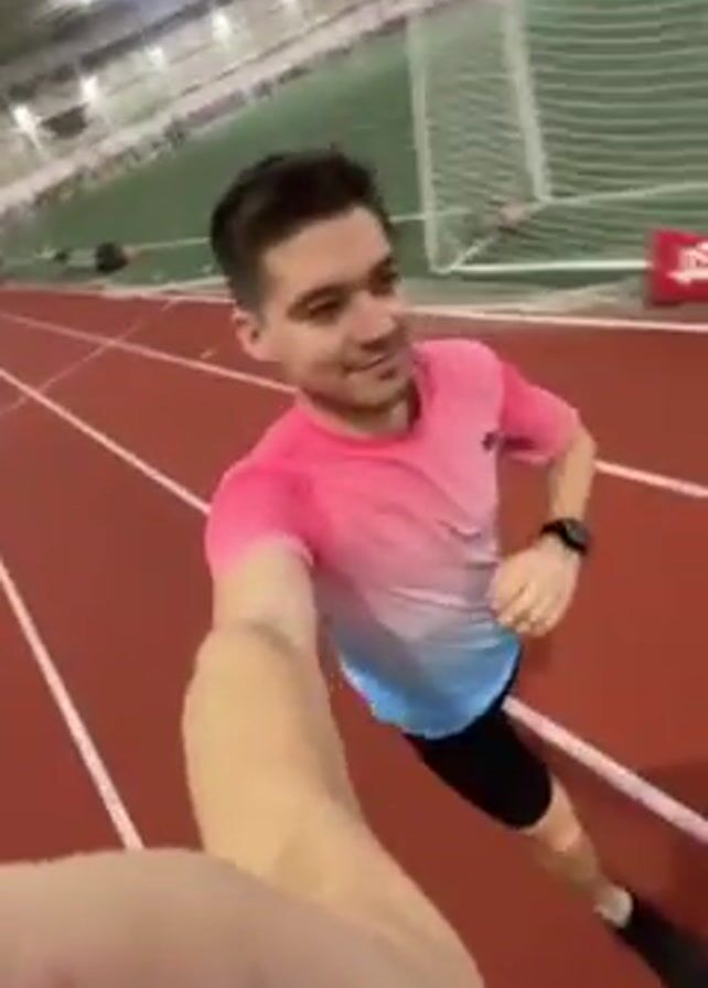 man running on an indoor track while holding his camera. He's wearing a short-sleeved shirt that fades from pink to blue and black running shorts. The track is red with white lines. In the background, there is green field and other people can be seen. The building has a high, arched ceiling. The camera moves with the man as he runs, capturing his face and the track in motion.