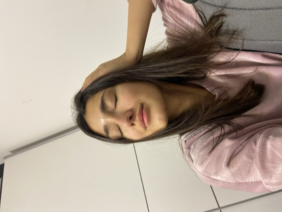 - "A young woman with long, dark hair and closed eyes rests her hand on her head" by FM-1ntxd2, licensed under CC BY 4.0