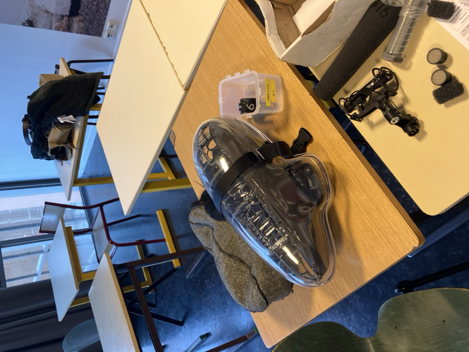 This image depicts the interior of what appears to be a classroom or workshop located in Saint-Denis, France. The scene is static, devoid of people, and illuminated by natural light entering through large windows along a back wall. In the foreground, two adjacent tables are visible. The table on the left has a light-brown wooden top, upon which a grey, textured textile item, resembling a soft bag or garment, is placed. Next to it, a clear plastic casing, possibly a protective housing for an electronic device, with a black adjustable strap and buckle is positioned. The word "CONNA" is faintly visible through the plastic. To the right of the casing, a small, clear rectangular plastic container with a yellow label reading "CHUX-Z-416" and "N° 6" holds a black object marked with the numeral "6". The table on the right, with a light beige top, displays various pieces of equipment, consistent with audio recording or broadcasting gear. These include a black microphone shock mount with attached cabling, a black cylindrical foam windscreen, two small circular mesh microphone grilles or filters, and several small clear plastic containers, one with a partially obscured white label. An open white cardboard box containing white packing material is also present on this table. In the midground, several unoccupied rectangular tables with light-colored tops and yellow metal frames are arranged. One chair, featuring a beige seat and back with a red metal frame, is positioned behind a table. A dark-colored bag or jacket rests on another table further back. The background reveals a large window expanse, through which an indistinct exterior with diffused light is visible. A white wall section displays an electrical outlet and a partially visible light-toned poster or artwork. The floor is dark-colored.