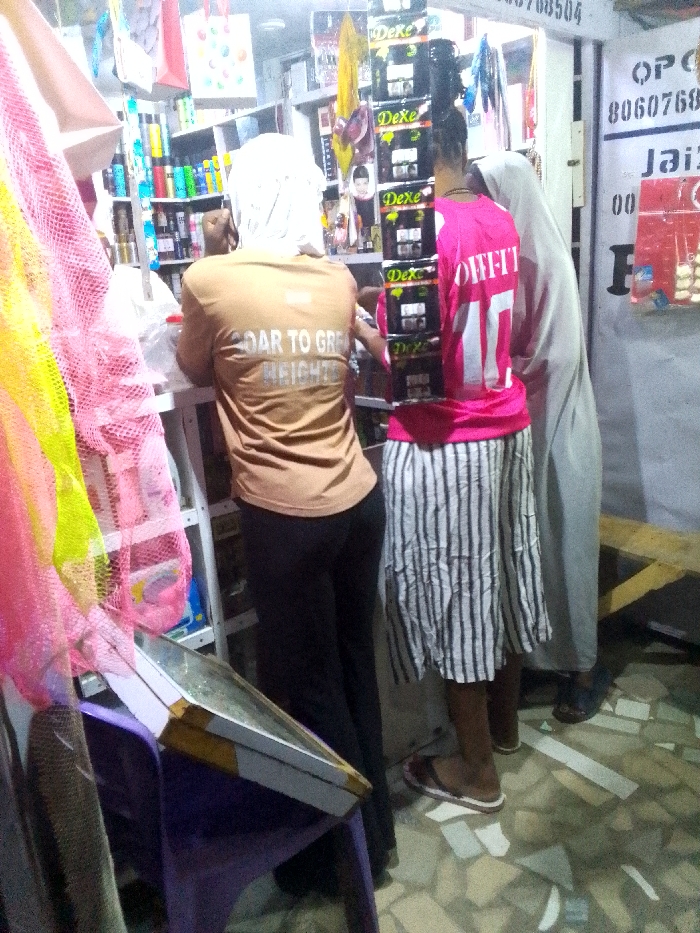 Three people stand in a cluttered shop. One woman wears a tan shirt with "SOAR TO GREAT HEIGHTS" printed on the back, black pants, and a white headscarf. The middle person is in a bright pink jersey with "OUTFIT 10" written in white, paired with a black and white striped skirt and sandals. A third individual in a long white robe stands to their right. Hanging from the ceiling are packets of "DeXe" products, and shelves stocked with goods are visible behind the people. A purple chair and a sales counter can be seen in the foreground.