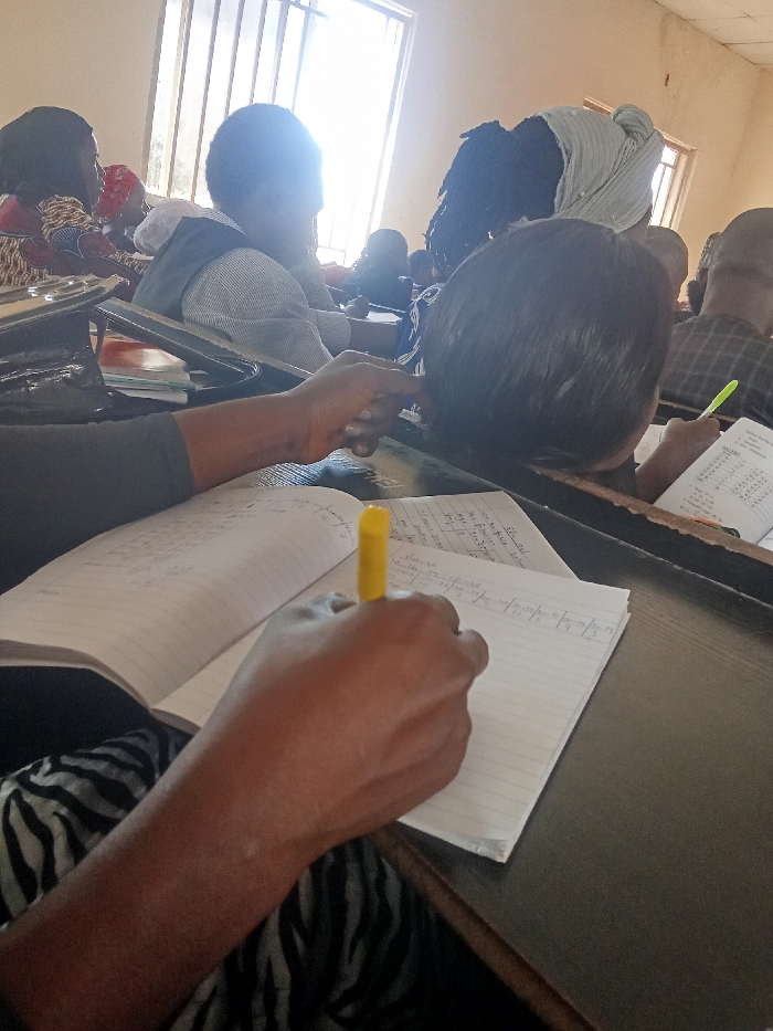The scene is an indoor classroom located in the city of Unknown, Unknown. Bright natural light enters the room through a large window with vertical bars on the back wall. Multiple individuals, approximately eight to ten, are seated at dark-colored desks. In the immediate foreground, a person with dark skin is actively writing in an open lined notebook using a yellow pen held in their right hand; their left hand rests on the notebook. This individual wears a black top over a black and white patterned lower garment. Directly in front of the foreground subject, another individual with short, dark hair is visible from behind, also writing in an open notebook with a lime green pen. Further into the midground and background, other individuals are partially visible, including one with dark dreadlocks and a light-colored headwrap, and another wearing a light-colored collared shirt and dark vest. All visible individuals are oriented towards the front of the classroom, engaged in individual work; no direct interactions between them are observed. The environment consists of basic classroom furniture and light-colored walls.