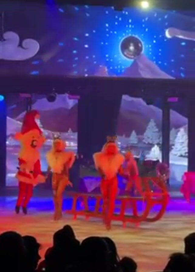 A stage performance unfolds before an audience in a darkened theater. On the stage, several individuals are costumed in elaborate outfits, including Santa Claus and reindeer. The figures dance around a wooden sled while the background displays a winter scene with snow-capped mountains, twinkling lights, and a disco ball. The lighting on stage is vibrant, with hues of red, green, blue, and purple illuminating the performers. The focus is on the dancers and the festive set design.