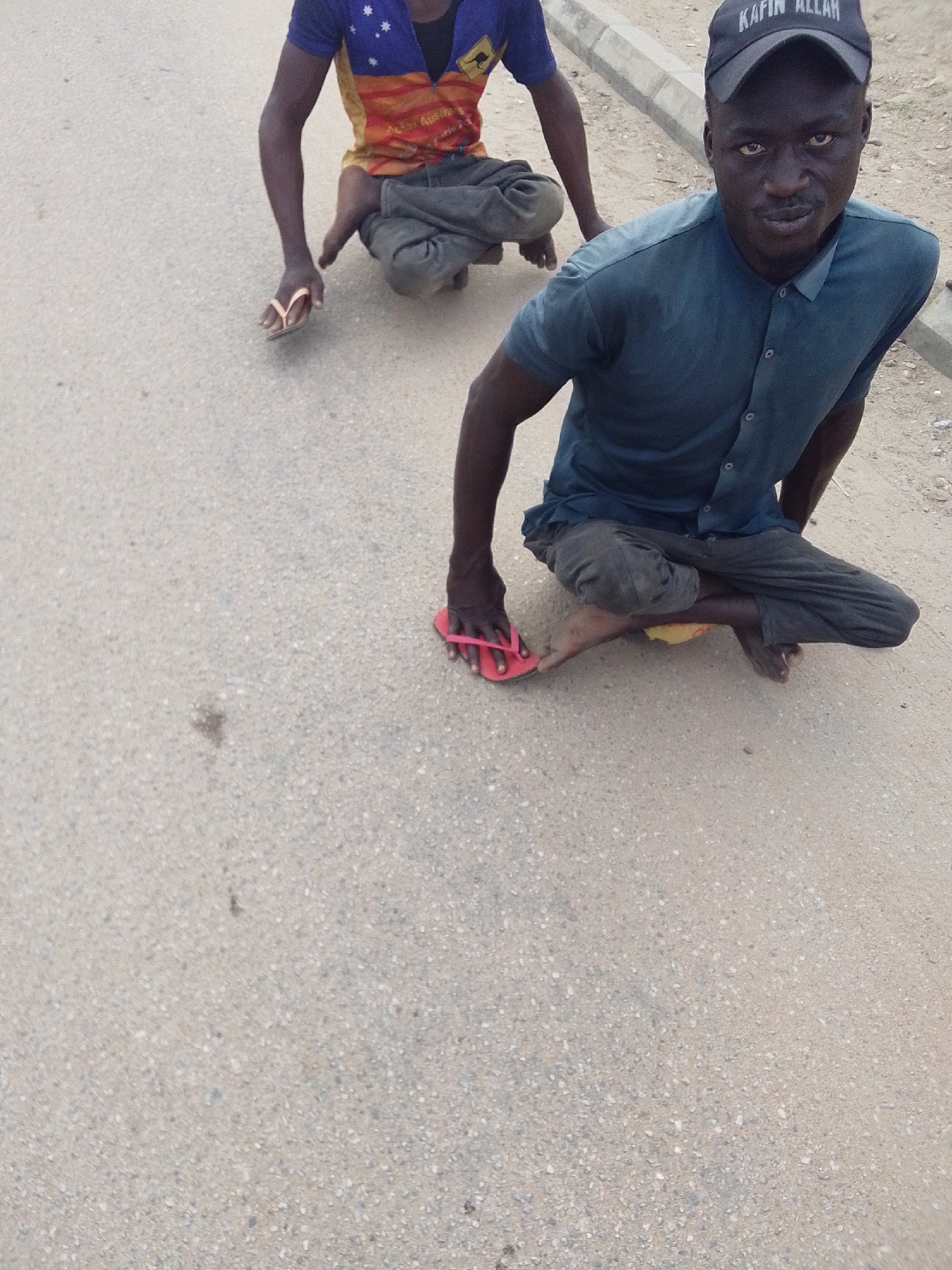 Two dark-skinned males are observed squatting on a light grey asphalt road surface adjacent to a concrete curb, in Lokoja, Nigeria. The foreground individual, positioned to the right, wears a dark blue short-sleeved collared shirt, dark trousers, and a dark baseball cap with white text, "KAFIN ALLAH". He is barefoot on his left foot and holds a single red flip-flop in his right hand. His bare right foot is visible beneath his right leg, and a yellow object is partially visible under his left leg. He gazes directly forward, towards the camera. The second individual, positioned further back and to the left, is partially visible and also squats. He wears a multi-colored short-sleeved t-shirt, featuring a blue section with white stars and an orange/yellow section with red patterns, over dark trousers. He holds a single light-colored (possibly white or beige) flip-flop in his right hand. The road surface exhibits a granular texture. A light grey concrete curb delineates the paved area from a rougher, lighter-colored ground surface in the background.
