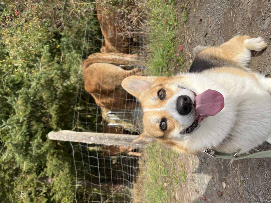 The image depicts an outdoor rural scene in Gangloff, Germany, under bright daylight conditions. In the foreground, a tricolor Pembroke Welsh Corgi with white, tan, and black fur is seated on a dirt and gravel path, facing directly towards the viewer. Its mouth is open, revealing an extended pink tongue, and its eyes are dark brown. A light green leash is visible on the left side of its neck, attached to a collar. Behind the Corgi, a wire mesh fence with a single weathered wooden post to the left separates the foreground from the midground. Beyond the fence, several light brown livestock animals, likely cattle, are present. One animal's hindquarters are prominently visible as it feeds from a metal hay feeder filled with hay. Another animal is partially visible further to the left behind the fence. The background consists of dense green foliage and trees, indicating a natural, possibly forested, environment. Shadows are cast on the ground, consistent with direct sunlight. No human figures are visible.