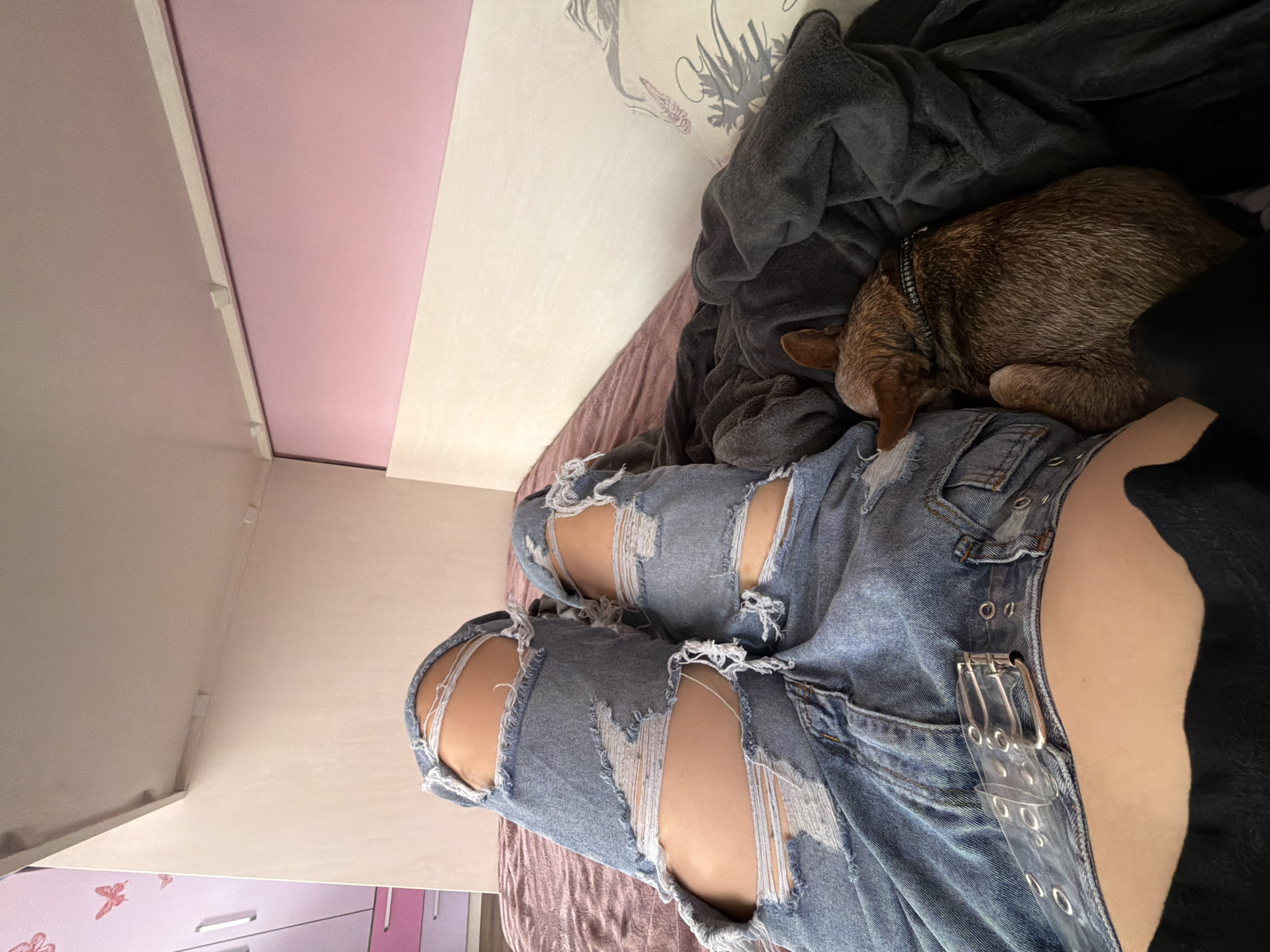 A medium shot of a person sitting on a bed. The person is wearing ripped denim jeans. A brown dog is curled up on the person's lap. The bed has a gray blanket. The wall is white with a floral design and a pink accent. The location is unknown.