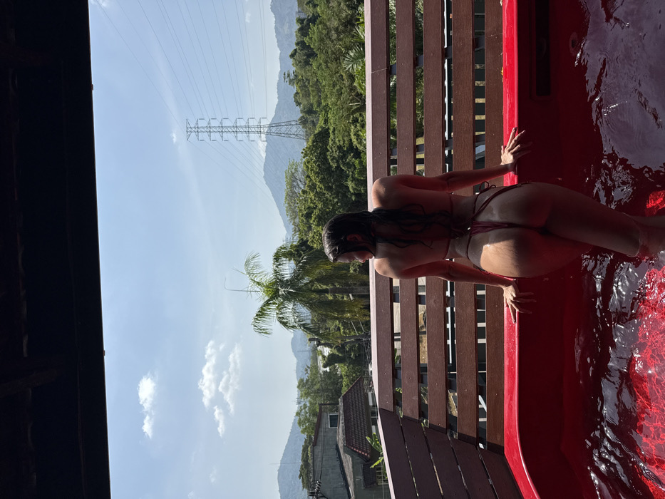 A woman in a bikini is in a red hot tub. She is leaning against the side of the tub. There is a wooden fence behind her. In the background, there are mountains, trees, and power lines. The sky is blue with some clouds. Part of a roof is in the upper left corner.