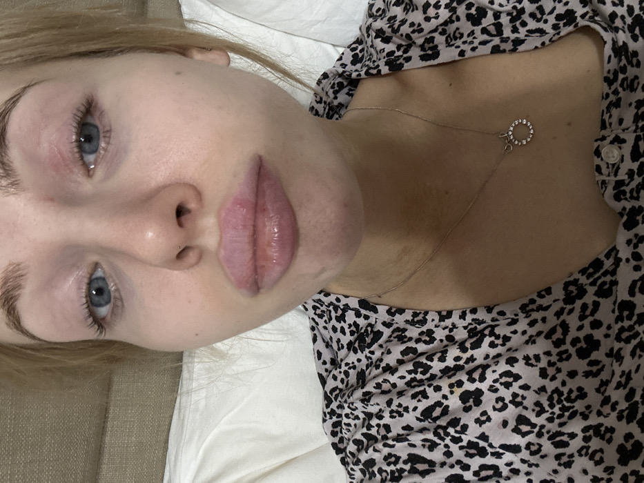 The image displays a close-up, front-facing view of a young adult female from the chest up, positioned indoors. She has light-colored hair and blue eyes, looking directly at the camera. Her lips exhibit significant swelling, particularly the upper lip, which appears distended and shows a prominent, lighter pinkish-purple discoloration centrally. The lower lip is also swollen and slightly uneven. There is an area of redness visible on the upper eyelid of her right eye (viewer's left). She is wearing a light-colored garment with a black leopard print pattern. Around her neck is a thin silver-colored chain necklace adorned with a circular pendant containing multiple small, clear, faceted stones. The background is largely out of focus, showing a white pillow and a tan, textured surface, indicative of a bed or headboard. The location in the city of Vsevolozhsk, Russia, cannot be determined from the visual information provided.