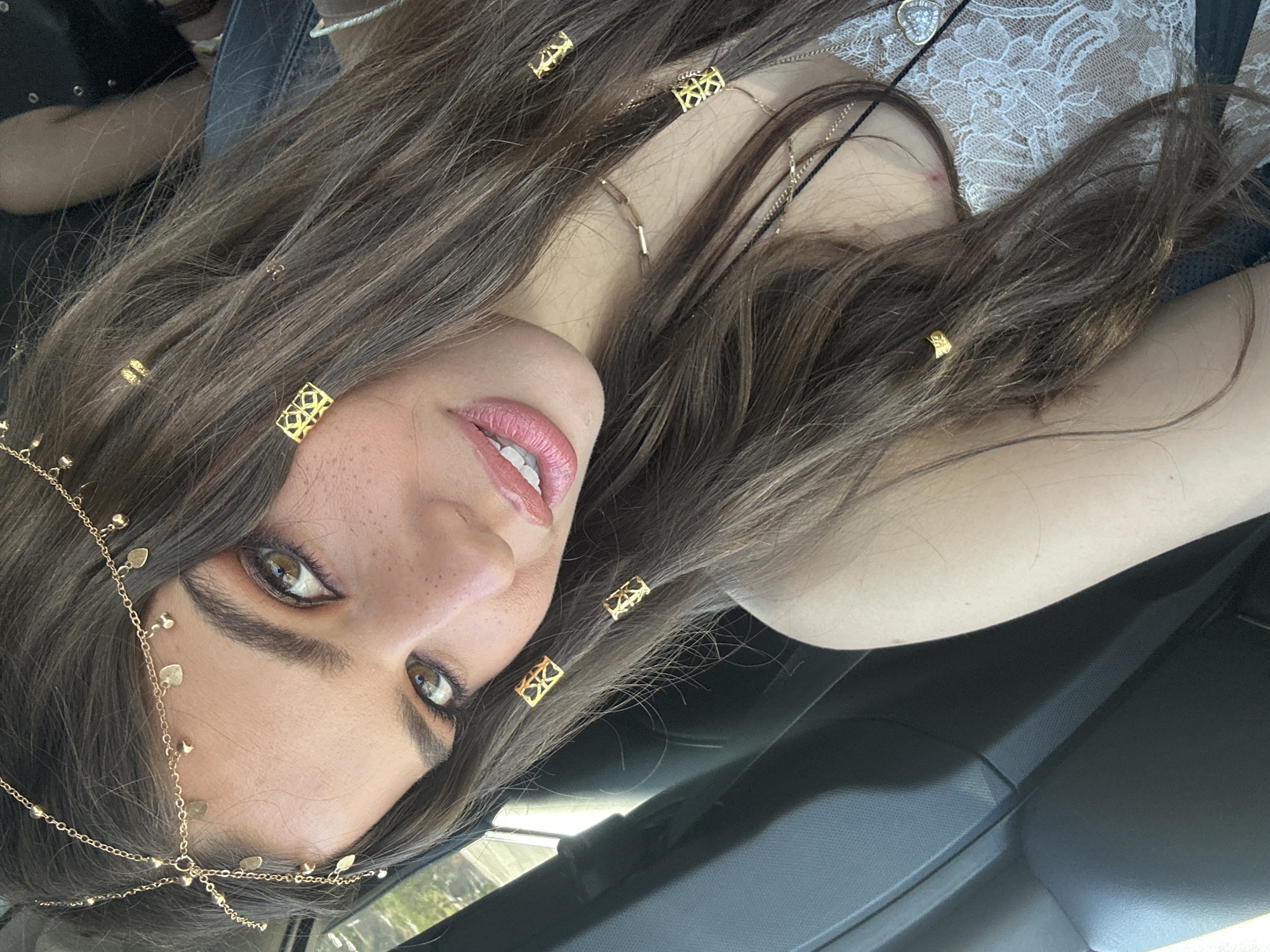 A young woman is seated in what appears to be a car, as suggested by the visible interior elements such as the dashboard and door trim. She is positioned in the driver's seat. The woman has long brown hair, adorned with gold-colored hair accessories. She has fair skin, light-colored eyes and pink lips. The background is blurred, with hints of greenery visible through the car window. The location of Rancho Mirage, United States of America is only inferred from the general environment in the image.