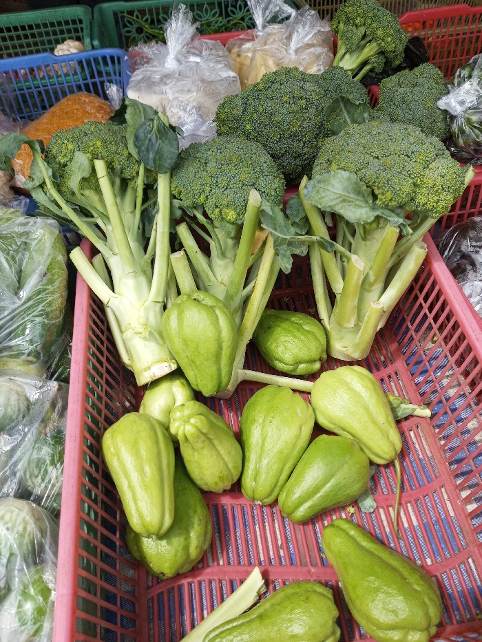 The image displays a close-up view of fresh produce arranged in plastic woven baskets, located at a market in Taohom, Laos. The primary subjects are multiple heads of green broccoli with dense florets and thick, pale green stalks, predominantly in the upper and mid-sections of the frame. Below the broccoli, numerous light green, pear-shaped chayote squash are visible, primarily in a pink plastic basket. In the background, additional green and blue plastic baskets are present, along with several clear plastic bags containing various other food items, including one with an orange-brown granular substance and others with lighter-colored contents, suggesting a diverse market stall. No people, actions, or direct interactions are depicted. The scene is well-lit, highlighting the textures and colors of the vegetables.