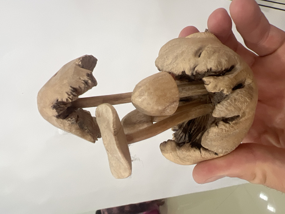 A right hand holds a light brown wooden sculpture of multiple mushrooms emerging from a textured wood base