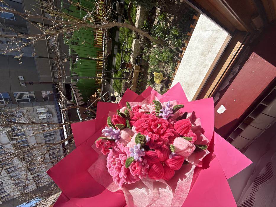 A large bouquet of artificial flowers, predominantly in shades of hot pink, fuchsia, light pink, and lavender with green stem accents, is positioned on a windowsill. The bouquet is wrapped in bright pink paper and an inner layer of translucent white or light pink tissue. The windowsill features a light-colored, tiled surface and a wooden frame; a white radiator is partially visible beneath the sill to the lower left. Outside the window, a residential garden or yard is visible, characterized by green grass, emerging spring foliage, and bare deciduous trees with visible buds. The garden contains a green wooden fence with a scalloped top, a wooden trellis structure, a rectangular wooden planter, various potted plants, and decorative metal garden elements resembling a miniature cart and other objects. A yellow plastic bag rests on the ground in the garden. Beyond the garden, multi-story residential buildings are visible, featuring numerous windows, balconies, and external air conditioning units. The sky overhead is clear and blue. The scene is illuminated by bright daylight, casting distinct shadows. The described location is within the city of Kyustendil, Bulgaria. No individuals or specific interactions are depicted.