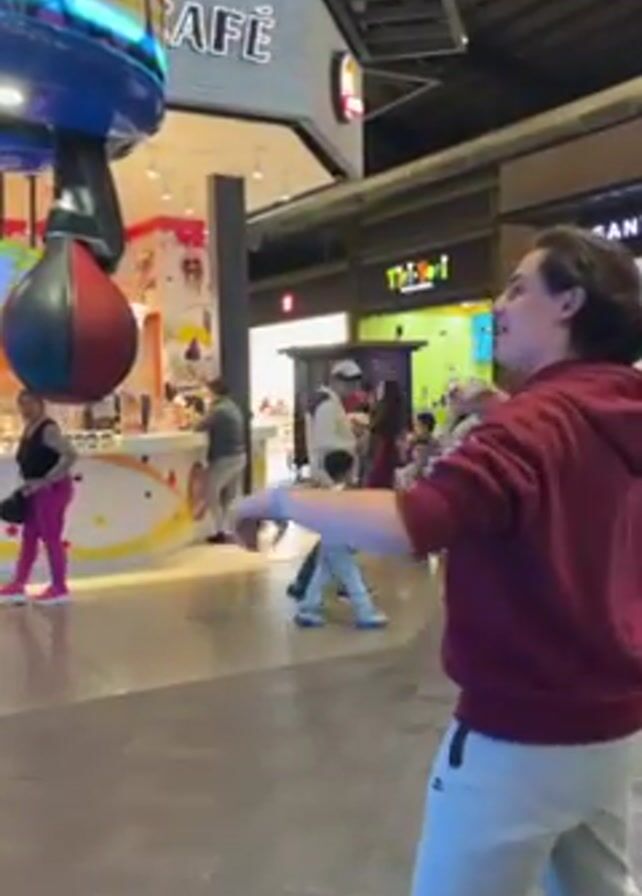 young man in a burgundy hoodie and light grey sweatpants punching a speed bag machine in a brightly lit mall