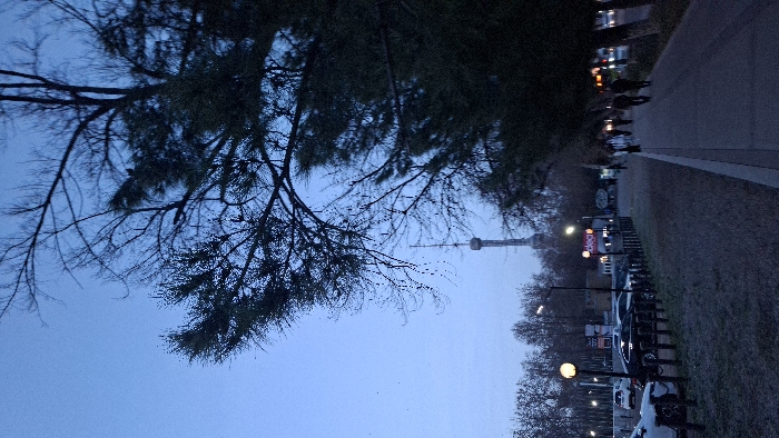 The image presents an outdoor urban scene in Tashkent, Uzbekistan, captured during low light conditions, likely dusk or dawn. The prominent landmark, the Tashkent TV Tower, is visible in the distant background, partially obscured by bare deciduous trees. In the foreground, a large, dark coniferous tree with dense foliage occupies the right side, extending into the upper right corner. To the left, a patch of ground appears to be covered in frost or sparse, low-lying vegetation. A low wooden fence line with evenly spaced posts separates this ground from a parking area. The mid-ground features a parking lot on the left containing several vehicles, including a white SUV and multiple dark sedans. Streetlights with spherical, amber-glowing lamps illuminate this area. Beyond the parking, a building with an illuminated orange-red sign displaying "dea" is discernible, along with other faint building lights. A paved pedestrian walkway (sidewalk) runs along the right side of the image, parallel to the parking area. Approximately six indistinct human figures, mostly appearing as dark silhouettes, are walking along this pathway away from the camera's perspective. The sky is a clear, dull blue, indicative of the transitional lighting. Artificial lights from streetlamps, buildings, and distant vehicles are active, contrasting with the fading natural light. The overall environment suggests a cool temperature, consistent with the visible frost and bare tree branches.
