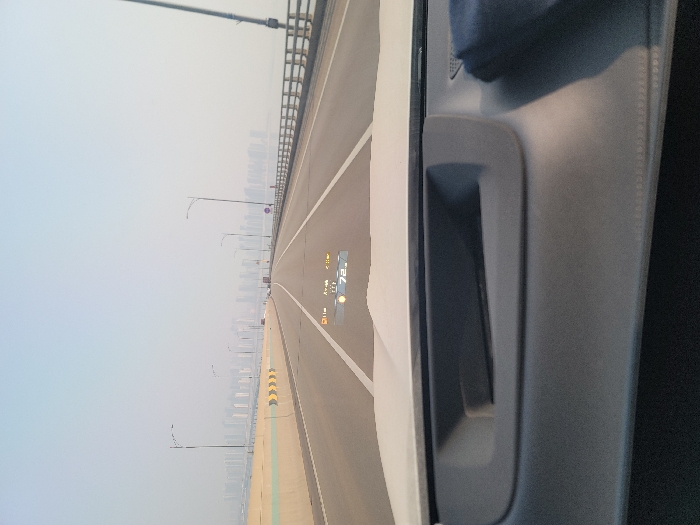 A car dashboard frames a road view. The road is a multi-lane highway on a bridge, lined with guardrails and streetlights. Distant city buildings fade into a hazy sky. On the dashboard, a head-up display shows a speed of 72 and other driving information. The car's interior is a neutral gray color. The image's orientation is sideways.