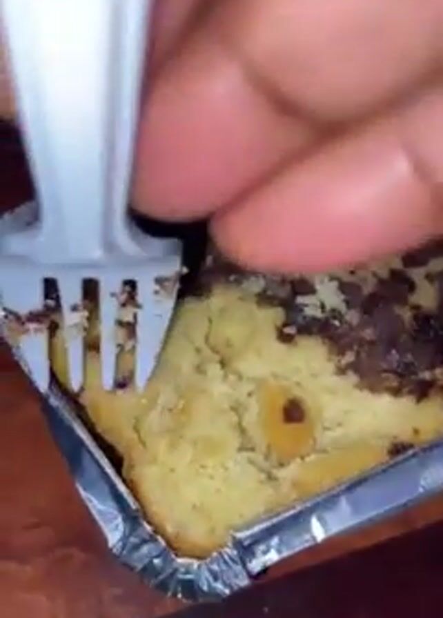 A close-up shot shows a hand using a white plastic fork to take a piece of yellow cake with dark brown crumbles on top. The cake is in a small, rectangular aluminum foil container. The fork pierces the cake, and a bite-sized piece is lifted. The background includes a dark, shiny surface and a black bag. The scene appears to be indoors, possibly on a table.