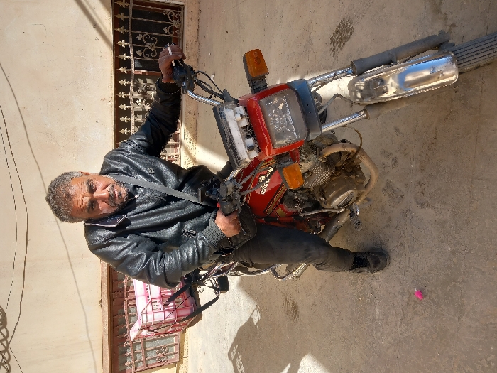 An adult male with short, graying hair and beard, and dark eyes, is seated on a red Kingway motorcycle on a paved surface in Munin, Syria
