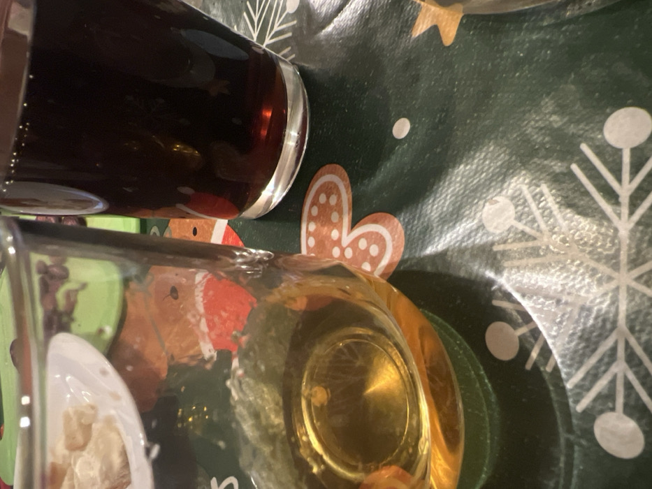 A close-up, high-angle view depicts two glasses positioned on a dark green table covering adorned with festive patterns, including white snowflake motifs and orange-brown stylized gingerbread figures. The left glass, cylindrical and transparent, is partially filled with a translucent, golden-amber liquid, revealing a reflective, conical indentation at the bottom of the glass. Reflections within this glass include a segment of a white plate containing light-colored solid food items, positioned above the glass's rim, and blurry orange-red elements consistent with the table covering's design. The right glass, also transparent and cylindrical, is mostly full of a dark, opaque, reddish-brown liquid with visible carbonation bubbles near its surface. No individuals are present, and no actions are occurring. The environment is an indoor tabletop setting in Shrewsbury, United Kingdom.