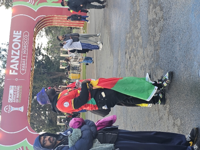 This image depicts an outdoor Fanzone for the CAF Africa Cup of Nations Morocco 25 in Rabat, Morocco
