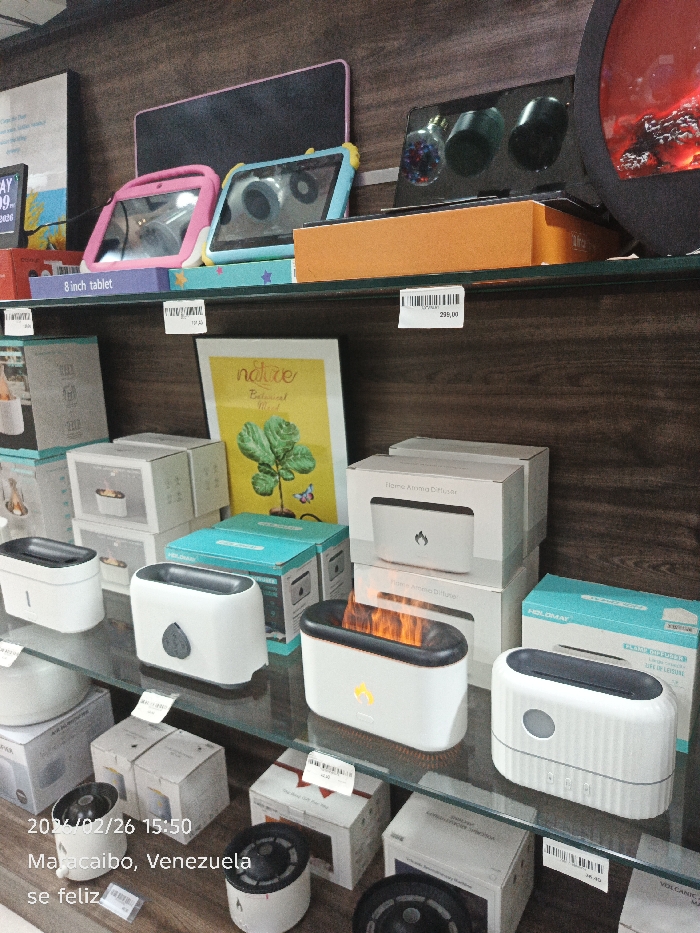 The image displays an indoor retail store shelf setup in Maracaibo, Venezuela, captured on February 26, 2023, at 15:50. The scene features three clear glass shelves against a dark brown wood-paneled back wall, showcasing various consumer products. On the top shelf, two 8-inch tablets are presented, each housed in a protective case: one pink and one light blue/green. An orange rectangular box is situated to their right, adjacent to a black rectangular object and a round decorative item emitting a red-orange simulated flame effect. Multiple white price tags with barcodes are affixed to the shelf edge; one clearly displays "298,00." The middle shelf exhibits an array of "Flame Aroma Diffuser" units and their packaging. In the foreground, a white, oval-shaped diffuser with a black top rim emits a visible artificial flame effect. To its left, another white rectangular diffuser features a black circular design on its front. A third white, ribbed, oval-shaped diffuser with a black top and a grey circular element is positioned to the right. Numerous product boxes, primarily white and light blue/teal, are stacked behind these devices; some are labeled "Home Aroma Diffuser" or "Flame Aroma Diffuser," while one box prominently features "nature Botanical Mind" text with a plant illustration. A price tag with "295,00" is also visible on this shelf. The bottom shelf contains several smaller product boxes and multiple cylindrical white objects with black tops. No individuals are present within the frame.
