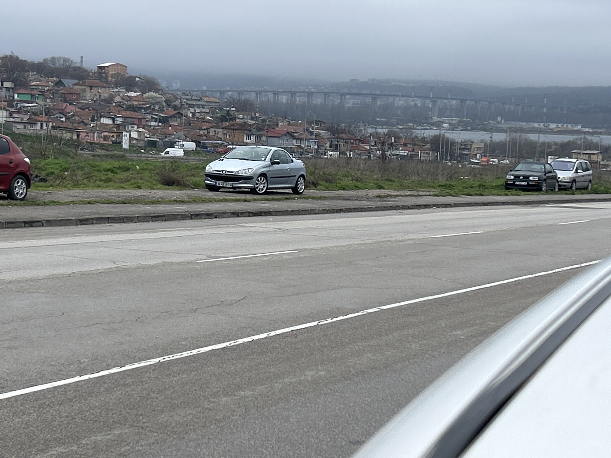 The image presents a street scene in Varna, Bulgaria, on a cloudy day. A silver Peugeot 206 CC is parked on the side of the road. A red hatchback and a black Volkswagen Golf are parked further down the road. Across the road, a sprawling settlement of small houses and structures covers a hillside. A large bridge is visible in the distance, partially obscured by fog. A gray road stretches across the foreground, with white lines marking the lanes. The lower right corner of the image is occupied by a blurry, silver object, likely part of the car from which the image was taken.