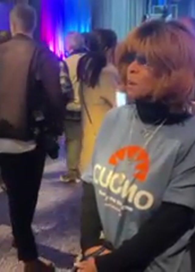 A woman in a light blue t-shirt with the word "CUCHO" and an orange sun logo is being recorded on a smartphone. She is surrounded by other people in what appears to be a crowded indoor event. Many people are milling about, and some are holding drinks. The woman in the CUCHO shirt is speaking, gesturing with her hands, and wearing sunglasses. The phone recording her is held by someone with a red wristband. The background features blue and purple lighting, suggesting a professional or corporate event.