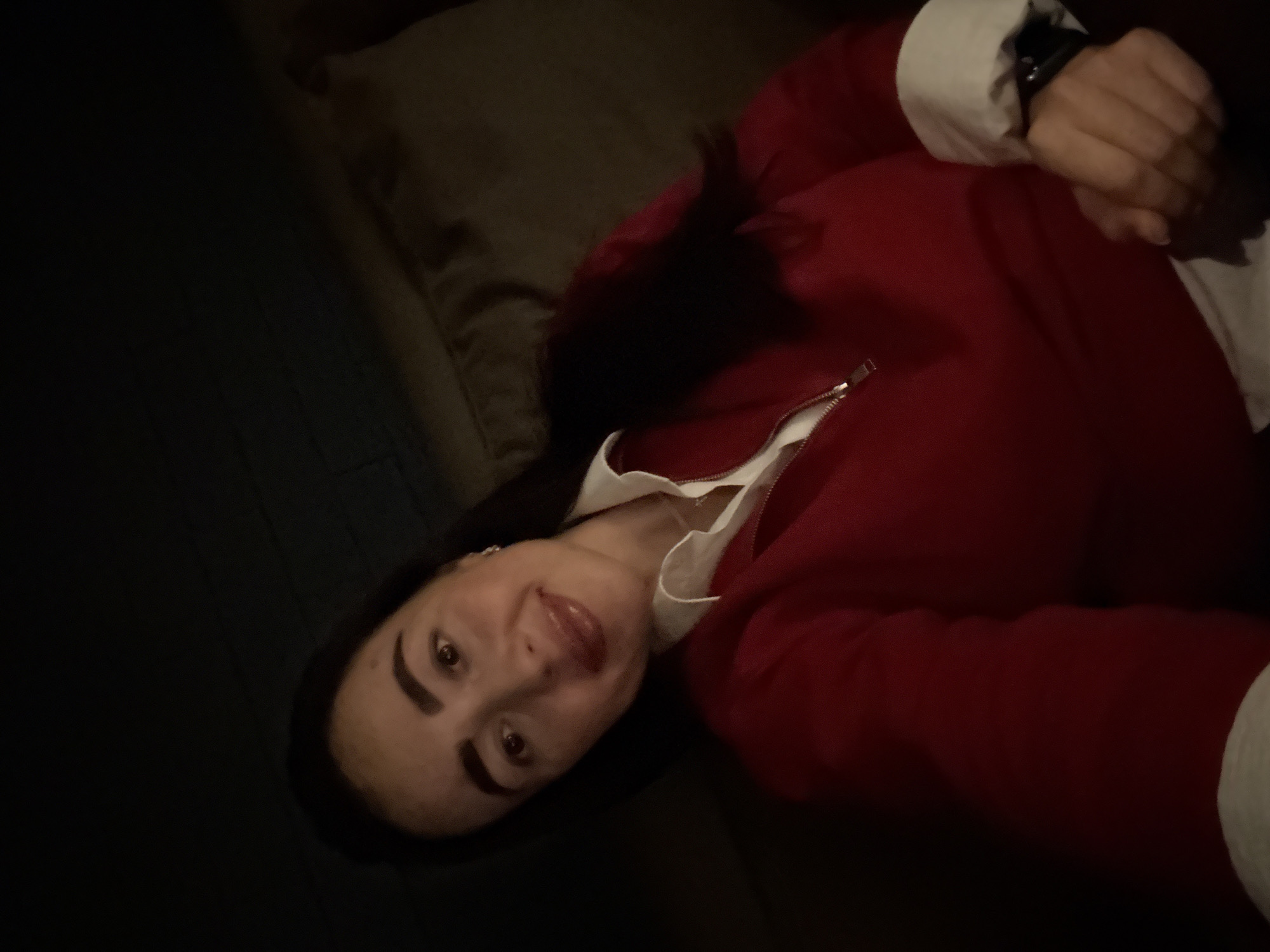 A female individual is depicted in a dimly lit indoor environment. She is an adult with dark hair, a light complexion, and is looking directly at the camera with a slight smile. Her lips are glossy. She wears a white collared shirt underneath a red quarter-zip pullover with a silver-colored zipper. A thin silver-colored necklace is visible, and a small stud earring is present in her left ear. A dark wristband, consistent with a smartwatch or fitness tracker, is visible on her left wrist. The background is dark and indistinct, featuring subtly textured surfaces suggestive of furniture or walls, consistent with a residential or lounge setting. The specific location within the city of Surgut, Russia, cannot be determined from the visual information provided.