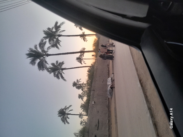 street lined with palm trees, captured from inside a car. People walk and pray along the side of the road. The sky is illuminated by the setting sun, creating a silhouette effect on the palm trees. The scene appears to be in a warm climate. A car window frame is visible on the right side of the frame, partially obscuring the view. The picture was taken with a Galaxy A14 phone.