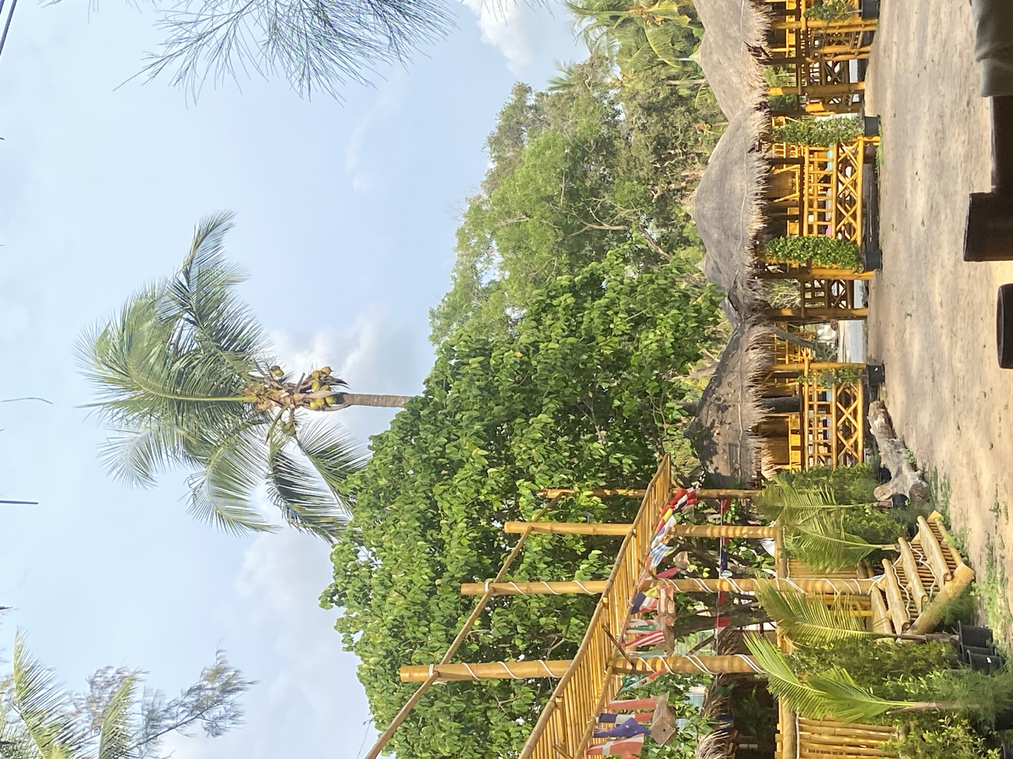 The image depicts an outdoor scene in Tambon Mai Khao, Thailand. A tall coconut palm tree stands prominently on the left, laden with coconuts. Lush green foliage dominates the background. To the right, there are several bamboo structures, possibly huts or platforms, with thatched roofs. A bamboo bridge, adorned with colorful flags, extends towards the huts. The ground appears sandy, suggesting a beach location. The lighting indicates a bright, sunny day.