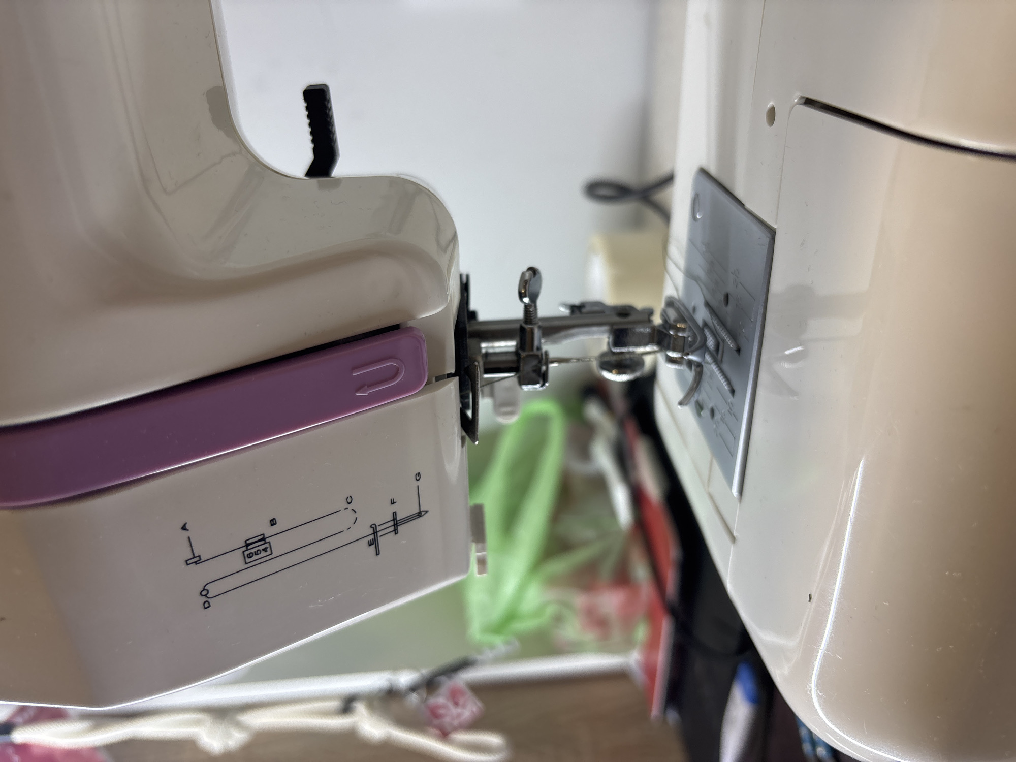 The image depicts a close-up view of two sections of a sewing machine. The left section is white with a purple accent and includes a diagram illustrating the threading path. The right section is also white and features a metal plate with markings. A silver, adjustable mechanism connects the two sections, likely part of the presser foot assembly. The background is blurred, showing indistinct shapes and colors that suggest a cluttered or domestic setting. The location in the city of Perm, Russia is not evident from the visual information available.