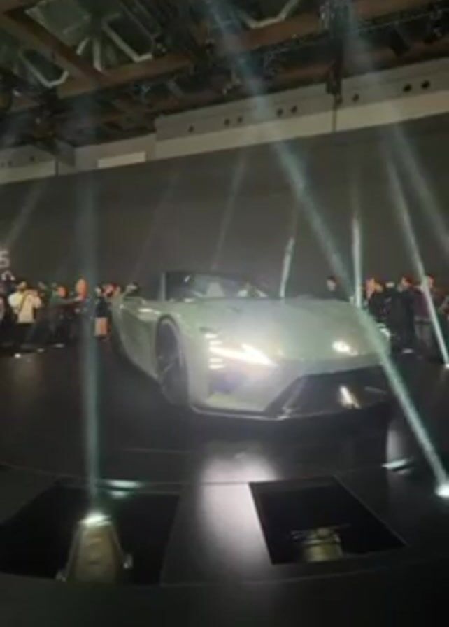 In a dimly lit indoor exhibition hall, a silver concept car is the focal point, rotating slowly on a black platform surrounded by spectators. Spotlights cut through the darkness, illuminating the sleek lines and sharp angles of the car's exterior, with the front headlights shining brightly. People are on both sides of the car with cameras and phones, capturing the car’s appearance. The exhibition hall is large and has a metal girder ceiling.