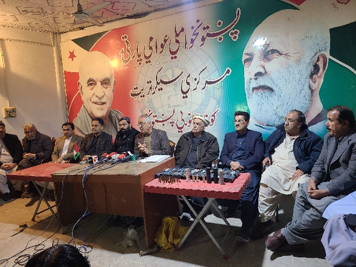 An indoor scene depicts an assembly of approximately 15-20 adult males within a facility identified by a large wall banner as belonging to the Pashtunkhwa Milli Awami Party's Central Secretariat, likely located in Quetta City Tehsil, Pakistan