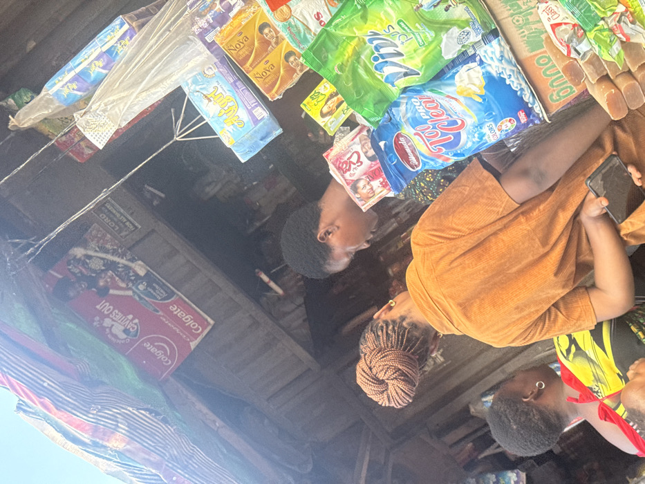 The image depicts an outdoor market stall or shop in Ekwulobia, Nigeria, under natural daylight