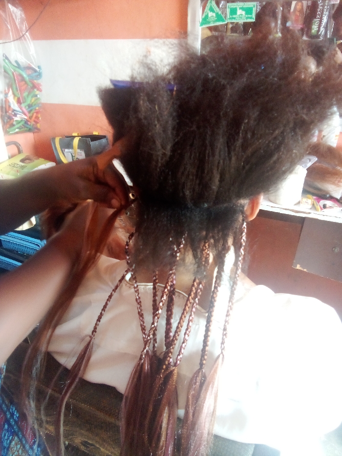The image captures an indoor scene within a hair braiding salon in Iju, Nigeria