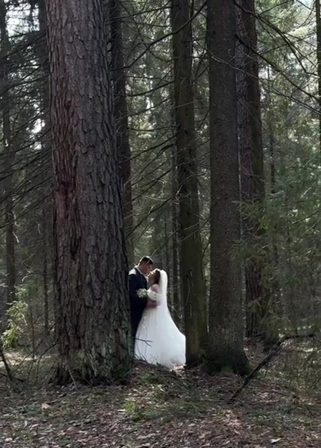 In a forest clearing with tall, bare-trunked trees and a carpet of dry leaves, a newly married couple embraces intimately. The groom, wearing a dark suit, cradles the bride close to him. The bride is dressed in a flowing white gown and a veil that covers her head, obscuring her hair. They are positioned between two trees, and the light filters through the branches, creating a somewhat shadowed scene. The interaction suggests a tender, romantic moment captured after a wedding ceremony.