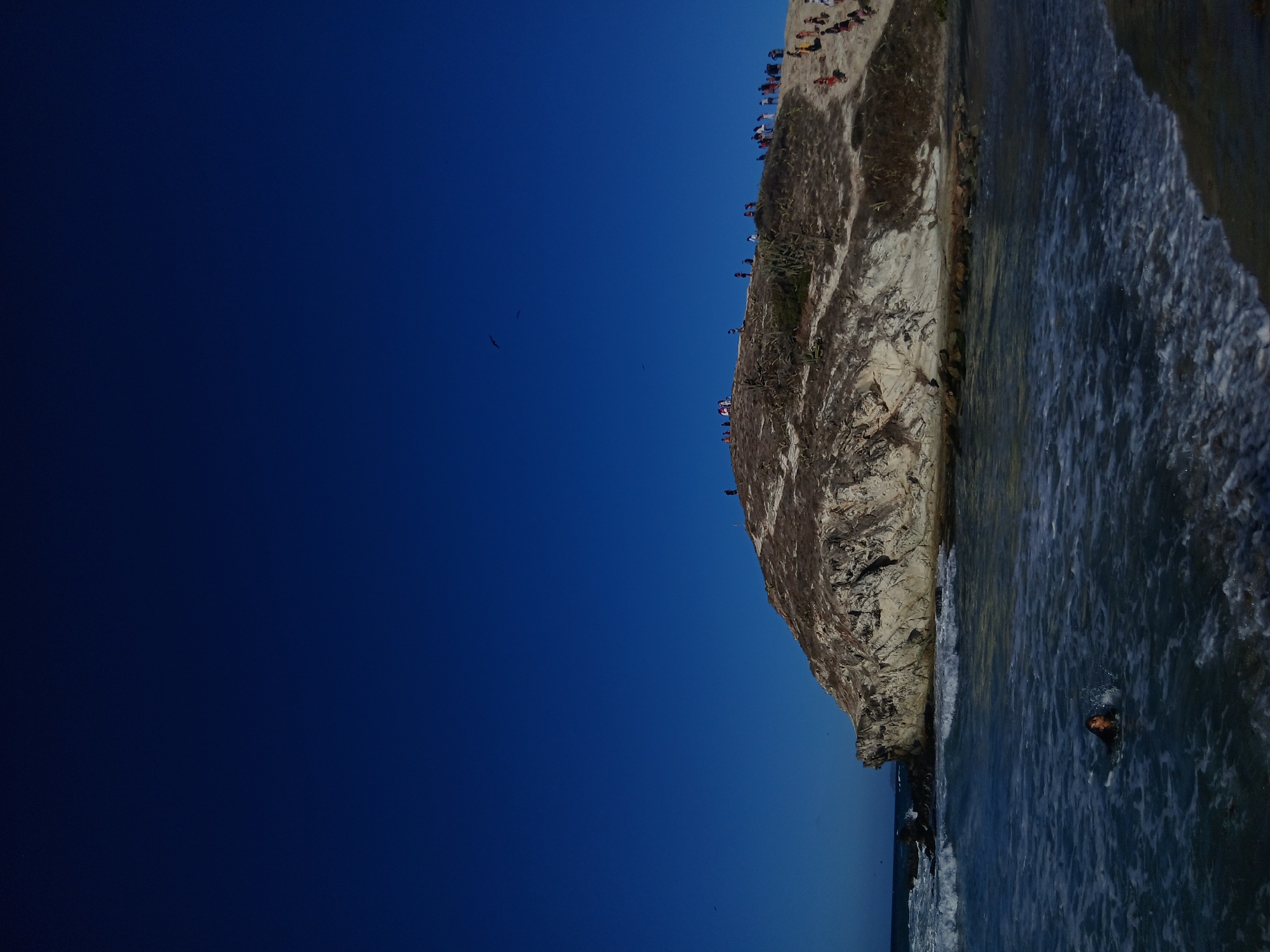 Located in Playa Parguito, Venezuela, the image shows a coastal scene with a cliff overlooking the ocean. People are gathered on top of the cliff. The water is choppy, and a person is seen swimming in the ocean. The sky is a clear, deep blue. Two birds are visible in the sky. The cliff face is rocky and textured, contrasting with the smooth, dark blue of the sky and the rippling water.