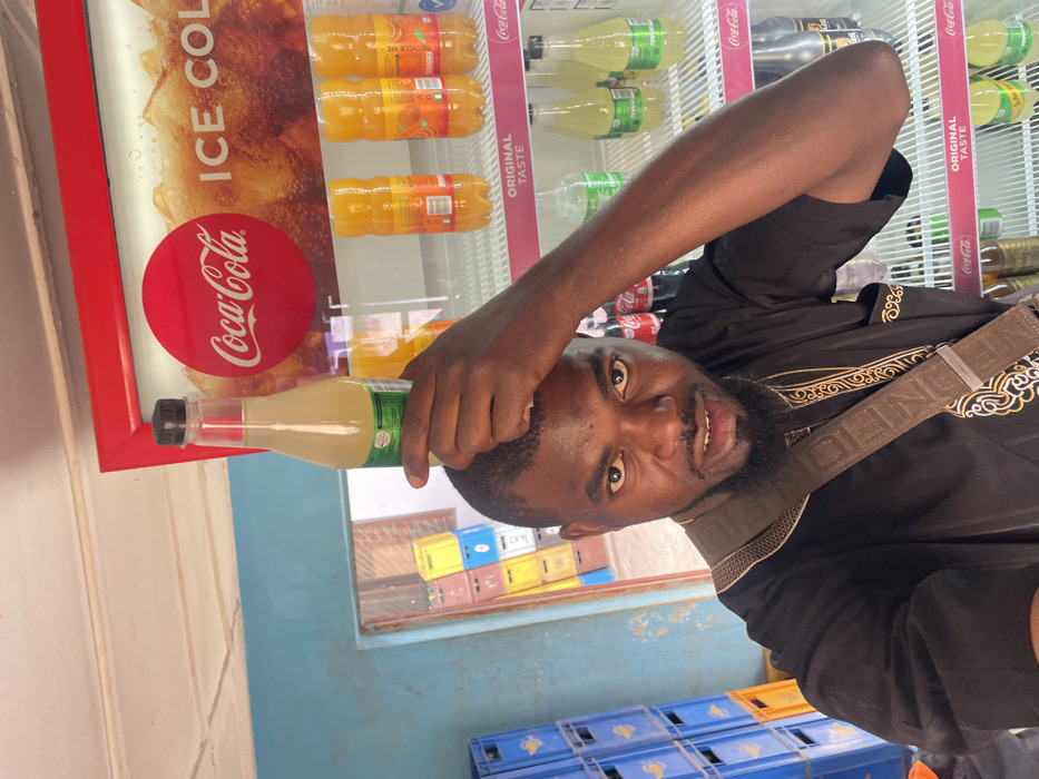 The image captures an indoor scene within a retail establishment, likely a shop or store, in Jos, Nigeria. A single adult male, with dark skin, a beard, and wearing a black tunic with gold embroidery, poses for the camera with a direct gaze and a slight smirk. He wears a brown shoulder bag across his chest. His right hand is raised, balancing a clear plastic bottle containing a light yellow liquid on the crown of his head. The bottle features a black cap and a green label. To the man's right, a prominent red-framed Coca-Cola branded display refrigerator stands, featuring a "Coca-Cola ICE COLD" banner at the top. Inside, multiple shelves are stocked with various bottled beverages. The top shelf displays several orange-colored soft drinks in plastic bottles. Lower shelves contain additional plastic bottles with light yellow liquid (similar to the one on the man's head), clear liquid, and dark-colored soft drinks. Pink strips along the shelves display "ORIGINAL TASTE." To the man's left, a stack of blue plastic crates is visible. In the background, beyond an open doorway or archway, multiple stacks of multi-colored plastic crates (yellow, blue, brown) are arranged. The interior walls are painted a light blue, and the ceiling is white with a textured finish. The specific address or precise location within Jos cannot be determined from the visual evidence provided.