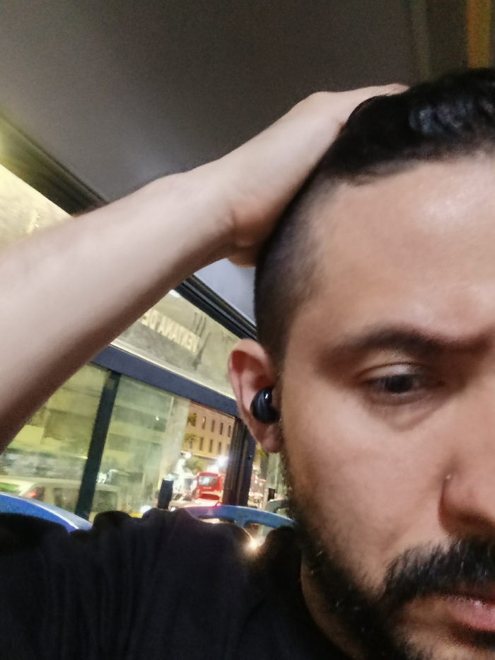A man with dark hair and a beard is wearing a black t-shirt. He has an earbud in his left ear. His left hand is on his head. The man appears to be on a bus as a city scene is visible through the window behind him. A red vehicle can be seen on the street outside.