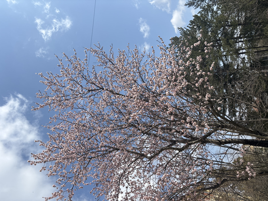 The image displays an outdoor scene in Shumen, Bulgaria, captured during daylight hours. A prominent deciduous tree, currently in full bloom with numerous light pink blossoms, occupies the central and left portions of the frame. The tree's branches are devoid of green leaves, indicating an early spring phase. Above and to the right, the sky is clear blue with scattered white cumulus clouds. A thin, dark utility wire extends horizontally across the upper right quadrant of the sky. In the background, to the right of the flowering tree, a cluster of dark green coniferous trees is visible. Further left, partially obscured by other leafless deciduous tree branches, a light-colored building structure is faintly discernible. No individuals are present in the captured scene.