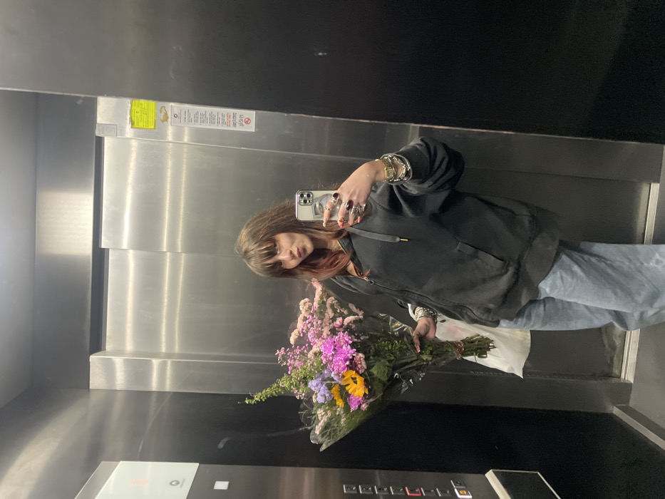 A person with shoulder-length brown hair and bangs takes a mirror selfie in an elevator. They wear a black zip-up hoodie and light-wash jeans. Multiple bracelets and rings adorn their hands. They hold a large bouquet of colorful flowers, including purple, pink, and yellow varieties. The elevator is made of brushed stainless steel and features a yellow sticker and a button panel.