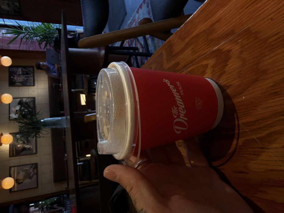 The image depicts an interior scene at "The Dreamer's House" located in Yerevan, Armenia. In the immediate foreground, a human hand, with a silver ring on the ring finger, lightly grasps a red disposable beverage cup. The cup is branded with "The Dreamer's House" in white script, above a smaller "SURA" logo with a leaf icon, and is topped with a clear plastic lid. The cup rests on a polished, medium-toned wooden table, exhibiting subtle surface scratches. The background reveals a cafe or co-working space. A long, dark wooden communal table occupies the mid-ground. At this table, a person wearing a blue long-sleeved top is seated, actively engaged with a silver laptop. Bench seating lines the wall behind the communal table. The wall above the bench is adorned with light-colored rectangular tiles and features multiple framed artworks, primarily black and white photographs or prints. Overhead, three spherical pendant lights emit a warm orange glow. A tall, narrow vase containing green foliage serves as a centerpiece on the communal table. Potted plants are visible on the far left and right sides of the background. A patterned rug is partially visible beneath a chair in the lower right portion of the frame.