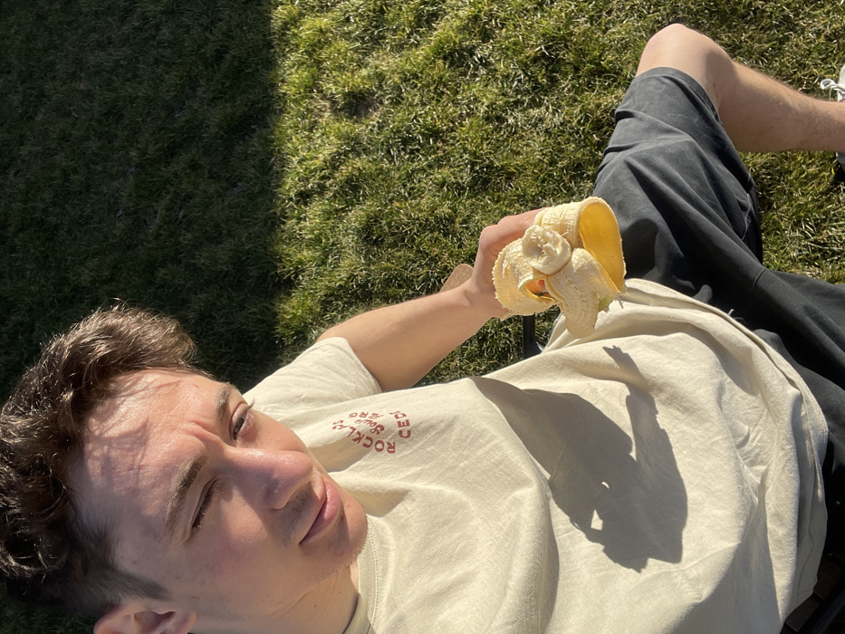 A young male is depicted outdoors in Sofia, Bulgaria, under direct sunlight, appearing to look slightly downward and to his left. He has short, dark brown hair. He wears a light-colored, short-sleeved t-shirt, which features a partially visible red graphic on the right chest, displaying text that includes "ROCKLYN" and "CED." Dark-colored shorts are also visible on his lower body. In his right hand, he holds a significantly peeled yellow banana, with most of the fruit consumed, leaving the peel partially wrapped around a small remaining portion. Strong sunlight casts a distinct shadow from his left arm across his t-shirt and shadows on his face. The background consists entirely of bright green, well-maintained grass.