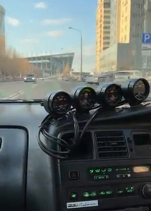 From inside a vehicle, dashboard instrumentation is visible in the foreground, four gauges mounted in a pod