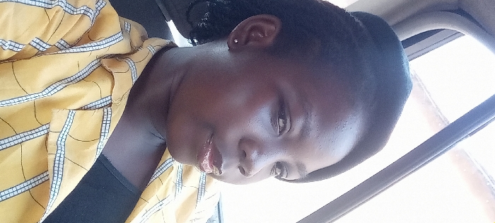 The image displays a female individual, likely an adult, seated within the interior of a vehicle. She has dark skin and wears a dark cap or beret covering braided hair. A small, silver-colored stud earring is present in her left ear. Her lips appear glossy. She is dressed in a dark inner garment, covered by an unbuttoned yellow collared shirt with a distinctive white grid-like pattern. Her head is turned slightly, and her gaze is directed away from the camera, towards her right. The background features a brightly illuminated, overexposed window, indicating daylight, with minimal, indistinct external features partially visible through it. Vehicle interior trim is visible on the left and right sides of the frame. The precise location within Ogbomosho, Nigeria, cannot be determined from the visual information provided.