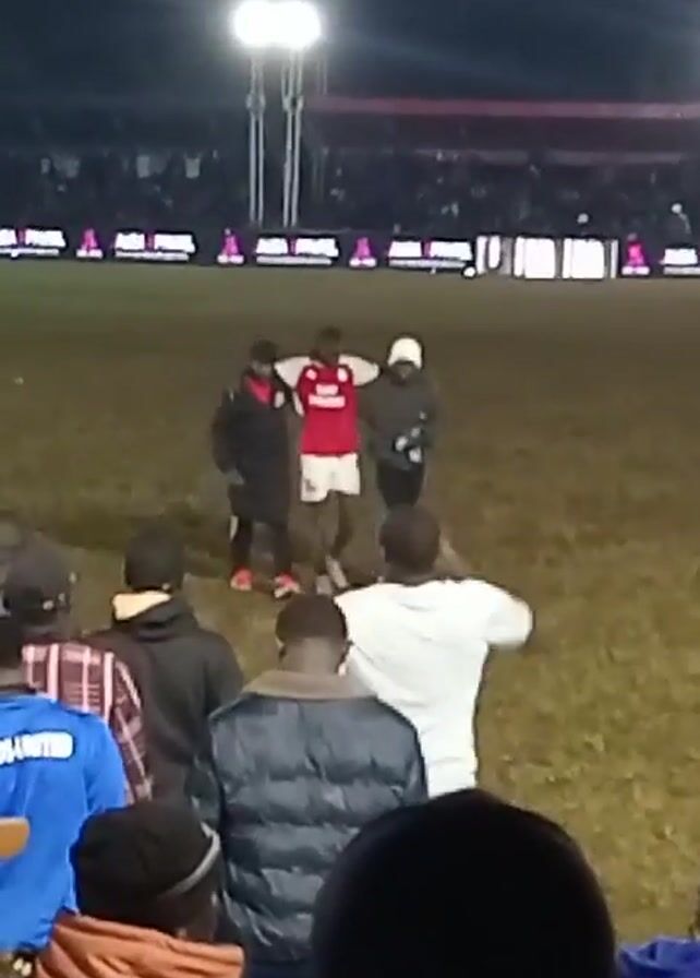 three people standing on a grassy field with a crowd in the background. A person wearing a red and white soccer jersey is flanked by two other individuals, one in a black jacket and another in a gray jacket and a white hat. The person in the soccer jersey has their arms draped over the shoulders of the two people next to them. The field is lit by bright overhead lights. A crowd of people are visible in the background. Several people are visible in the foreground, including one in a white shirt and one in a blue jacket. An audio track of a speaker or announcer can be heard during the video.