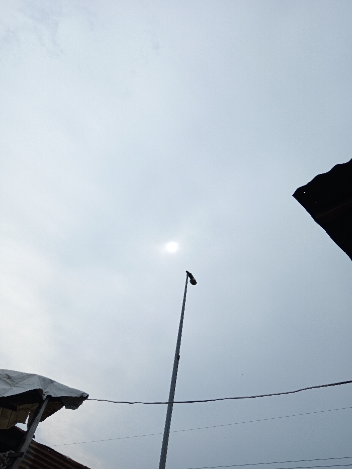 The image displays an upward view of an overcast sky, with a bright, diffuse sun visible through the thin cloud cover in the upper-mid portion of the frame. A tall, light-colored utility pole with a dark, downward-facing fixture at its apex stands vertically, slightly right of center. In the lower-left corner, a section of a corrugated metal roof, partially covered by a white, fabric-like tarp, is visible. The upper-right corner features a dark, angular edge of another corrugated metal roof. A dark-colored electrical or utility cable runs horizontally across the lower-mid section, passing behind the pole and appearing to lead towards the structure on the left. No individuals or specific actions are depicted within the scene, which is situated in an urban environment in Lagos, Nigeria.